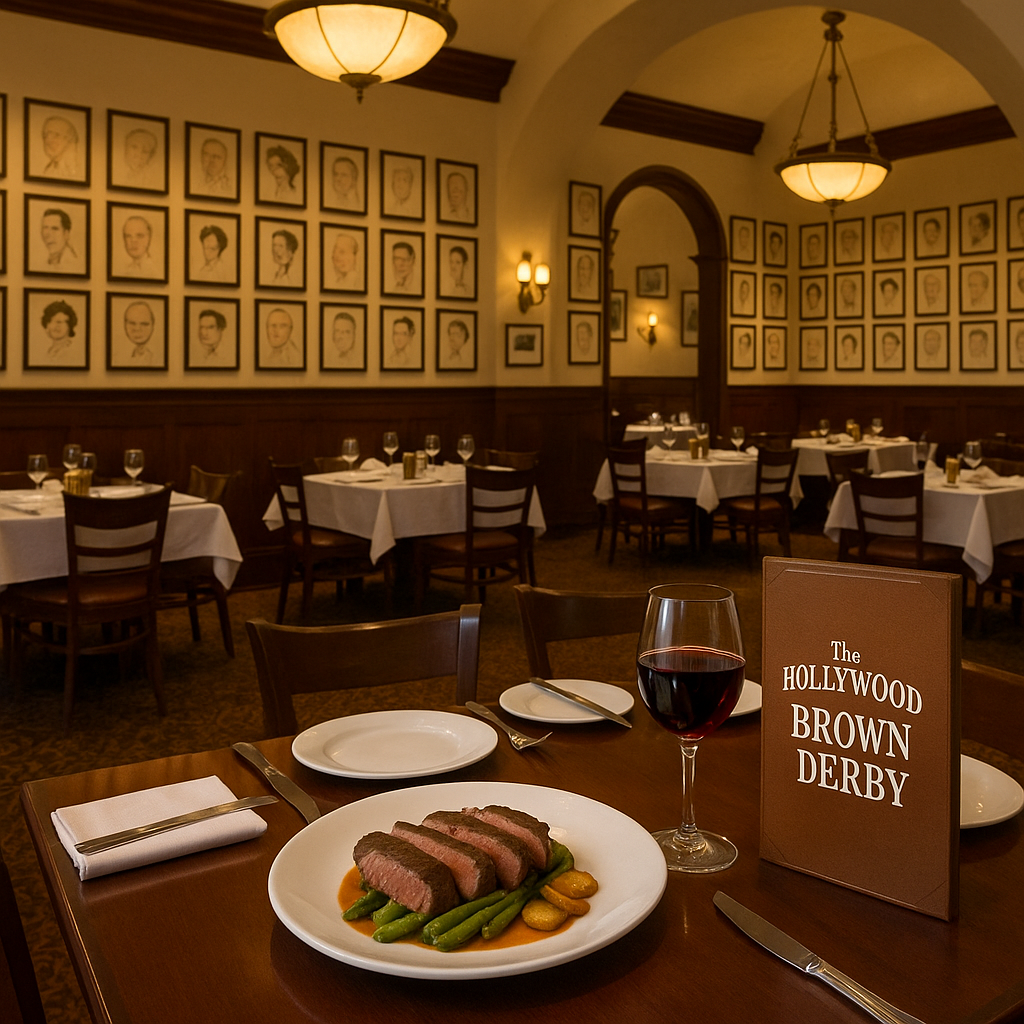 With warm wood-paneling and celebrity caricatures, The Hollywood Brown Derby harkens back to the Golden Age of Hollywood and serves savory American cuisine.