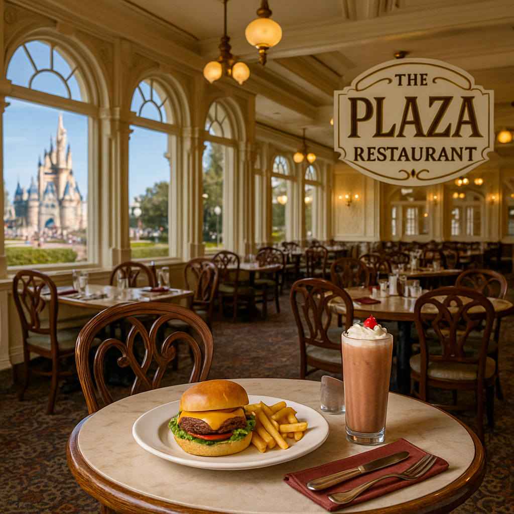 The Plaza Restaurant between Tomorrowland and Main Street, U.S.A. at Magic Kingdom park serves salads, sandwiches, burgers and ice cream fountain treats.