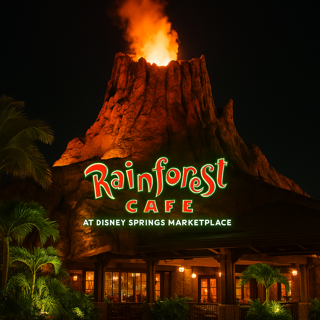 Jump into a lively jungle-themed setting and enjoy all-American fare for lunch or dinner at Rainforest Cafe at Disney Springs Marketplace.